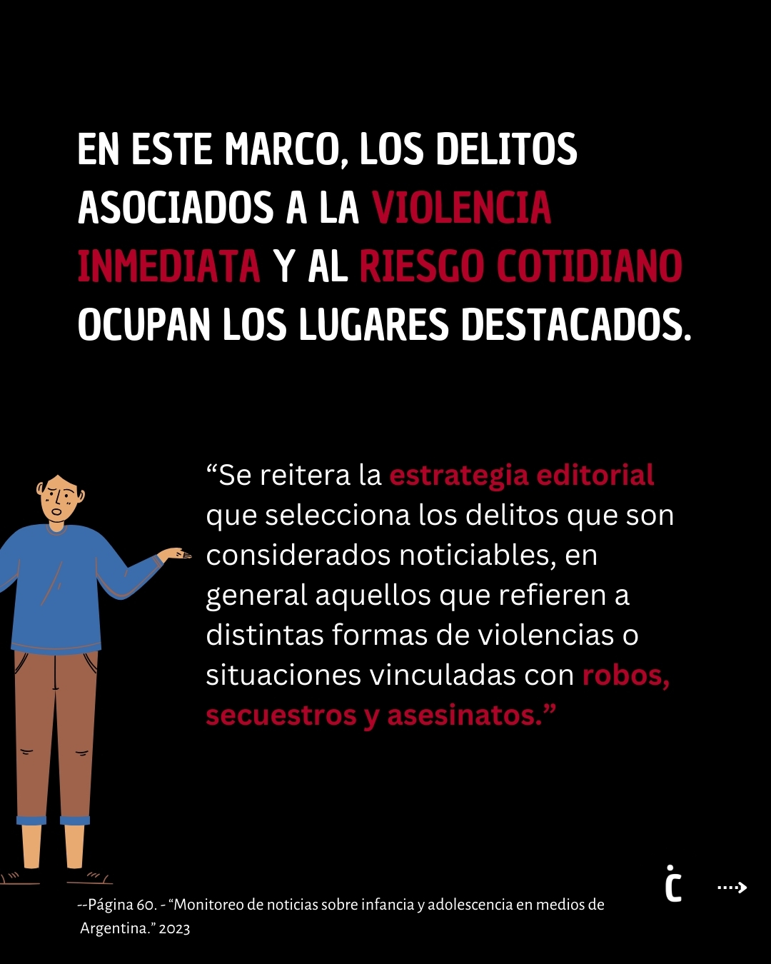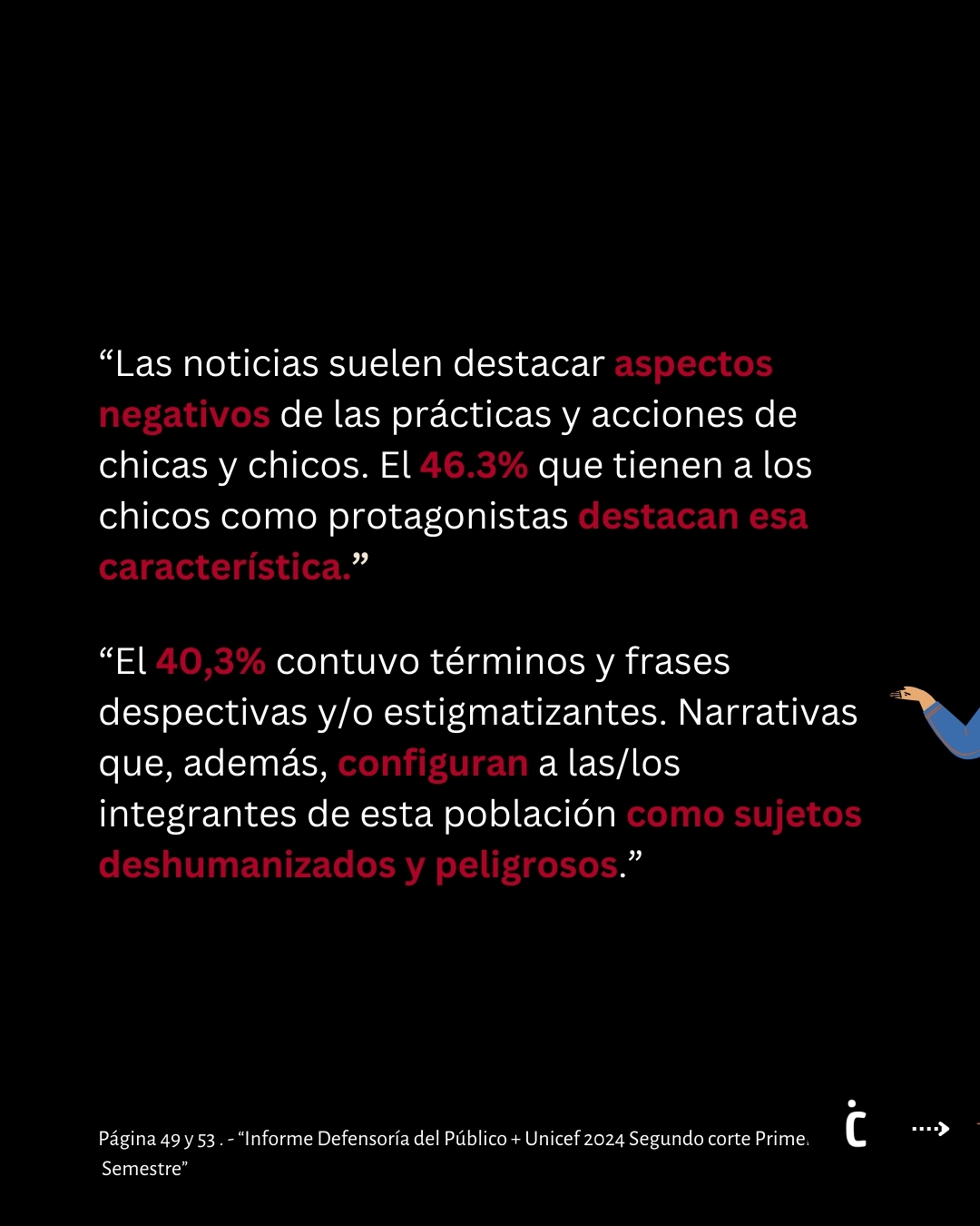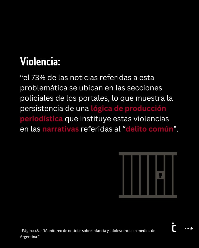 El estudio, destaca que el 46,3% de las noticias que tienen a niños, niñas y adolescentes como protagonistas se enfocan en aspectos negativos de sus prácticas y acciones. Además, el 40,3% de las noticias analizadas contienen términos y frases despectivas o estigmatizantes, configurando a los y las jóvenes como sujetos deshumanizados y peligrosos.