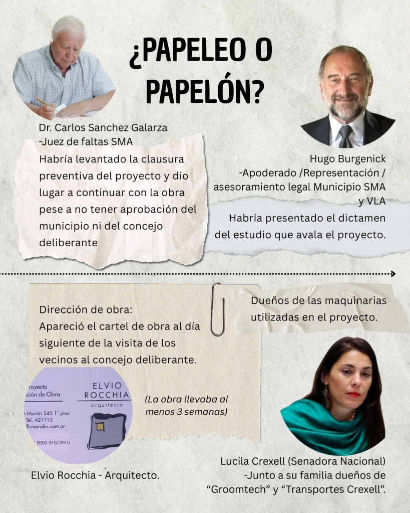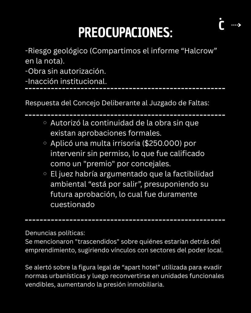 Sin expediente formal, todo son trascendidos. Según comentaron vecinos y concejales, se trataría de la construcción de un apart hotel, aunque aún no se ha hecho público quiénes están detrás del emprendimiento. El concejal Fernández denunció que en otros casos similares se ha utilizado la figura del apart para luego transformarlo en unidades funcionales de uso residencial o turístico, multiplicando la carga sobre la tierra sin control urbanístico.