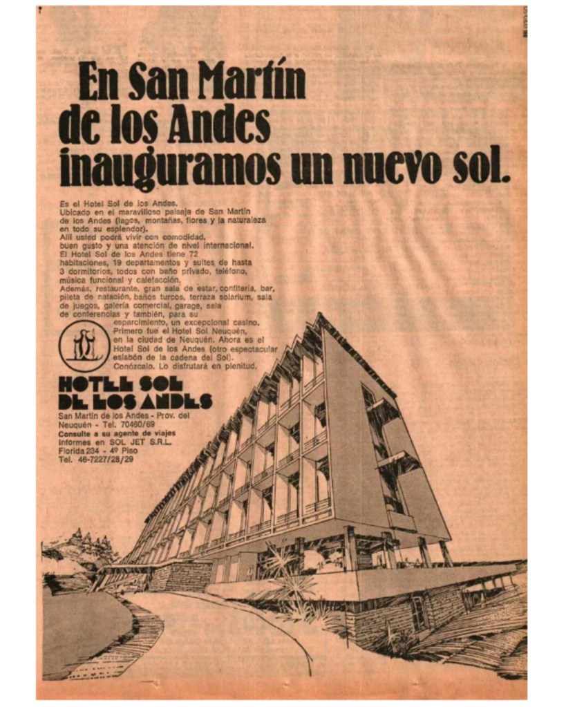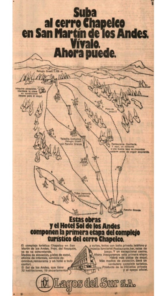 En noviembre de 1977 la provincia de Neuquén formó una sociedad de economía mixta con Lagos del Sur, denominada «Aldea del Sol» para explotar el complejo turístico de Chapelco, lo que incluía algunos negocios inmobiliarios con la venta de tierras públicas.