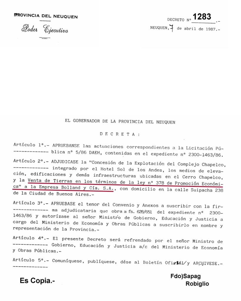 El primer ladrillo en la historia de la pérdida territorial del cerro Chapelco se colocó con el Decreto Provincial N.º 1283/1987. Bajo el argumento de promover el turismo y liberar al Estado de la gestión directa, el gobierno de Neuquén autorizó la desafectación de tierras fiscales ubicadas en el ejido de San Martín de los Andes, para destinarlas a uso turístico y recreativo.