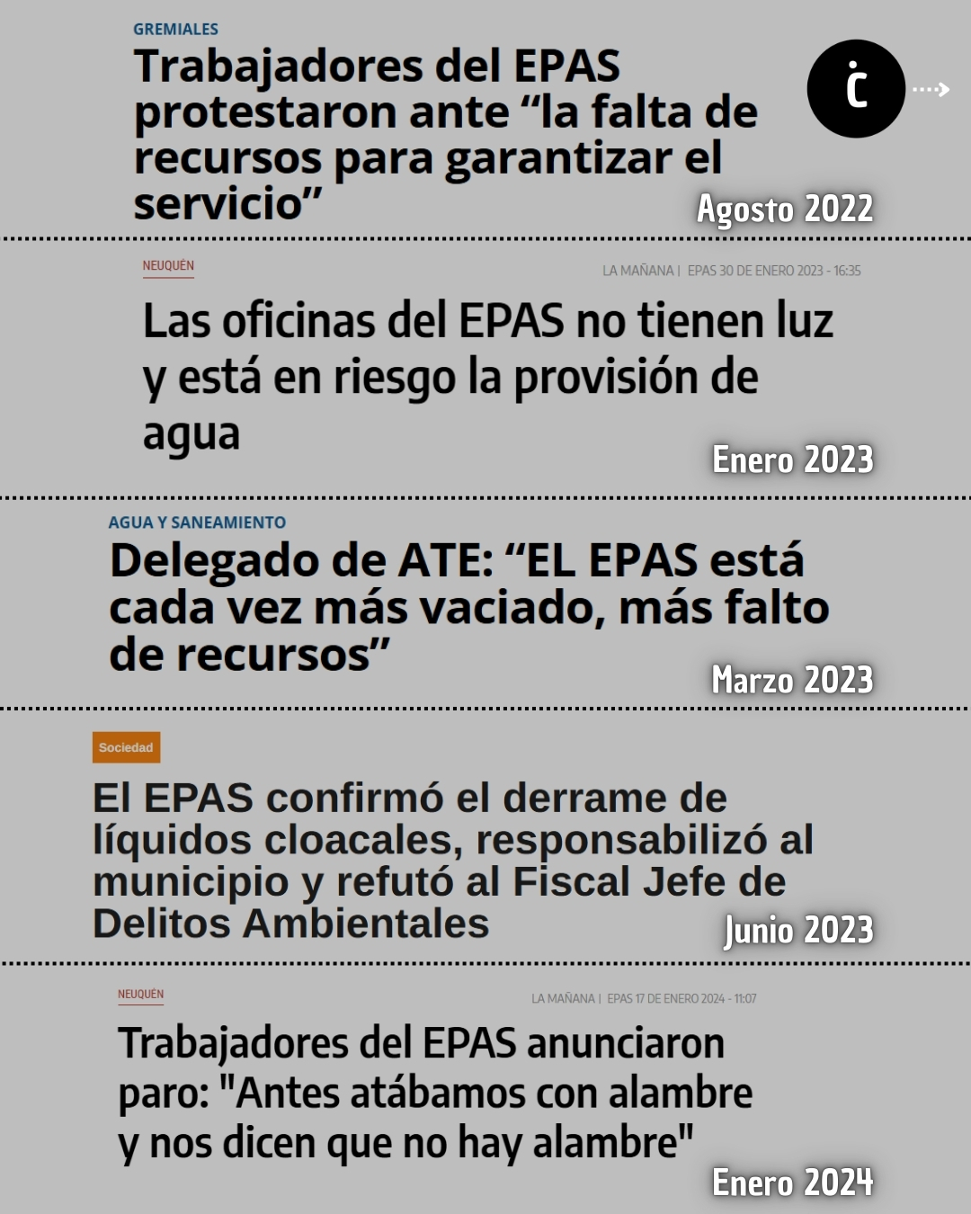 En 2021, trabajadores denunciaban que la planta del Parque Industrial de Neuquén (PIN) funcionaba con equipamiento deteriorado y sin mediciones básicas para el tratamiento de efluentes. En 2023, los mismos reclamos se repetían, sumados a cortes de agua en plena ola de calor y demoras en la reparación de cañerías troncales. En 2024, barrios enteros de Cutral Có y Zapala quedaban sin servicio por roturas no previstas en el cronograma de mantenimiento.