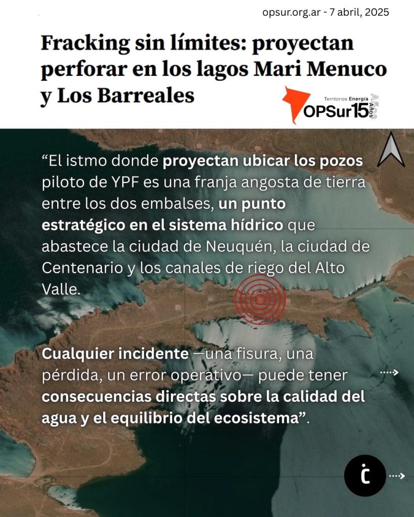 Hoy ese riesgo tiene forma de decreto: el N.º 276/2025, con el que el gobierno provincial le otorgó a YPF cuatro nuevas concesiones en Vaca Muerta por 35 años y una inversión anunciada de más de 13.000 millones de dólares. Entre ellas, La Angostura Sur II, ubicada en territorio de la comunidad mapuche Kaxipayiñ, proyecta la perforación de pozos piloto justo en el istmo que conecta Mari Menuco con Los Barreales.